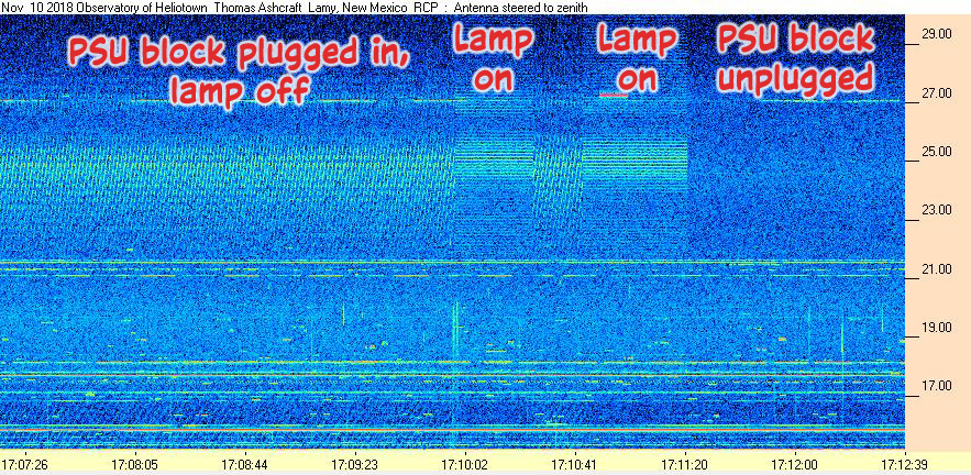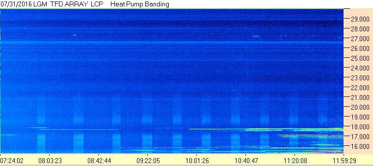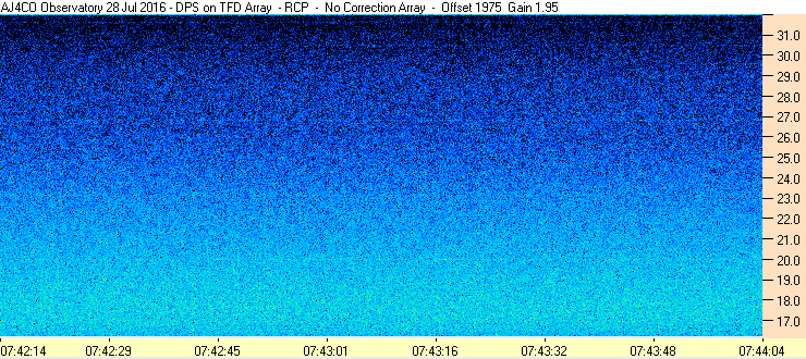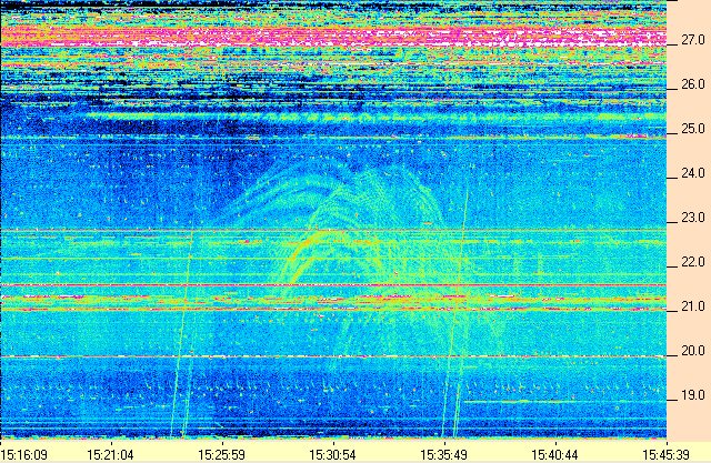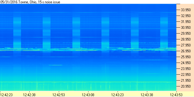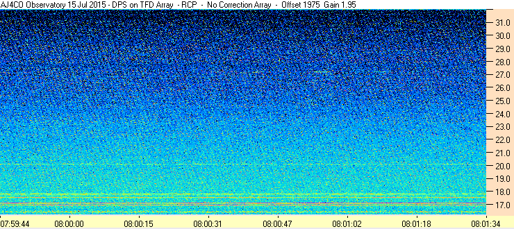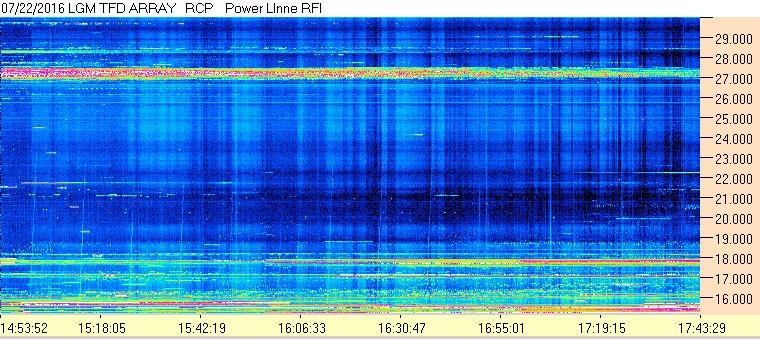 In the upper HF band, terrestrial communications signals are more of a problem during the daytime, which is when the ionosphere supports long distance propagation. These signals show up as horizontal bands and can be strong enough to cause the receiver to overload.