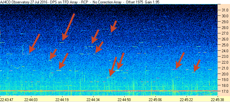 Small radar sets used by Homeland Security transmit over the entire upper HF band. Their signals are about 150 kHz wide and vary randomly in sweep rate, frequency, and timing. A few such emissions are marked with red arrows in the spectrogram below; however, note that there are far more that could be marked.